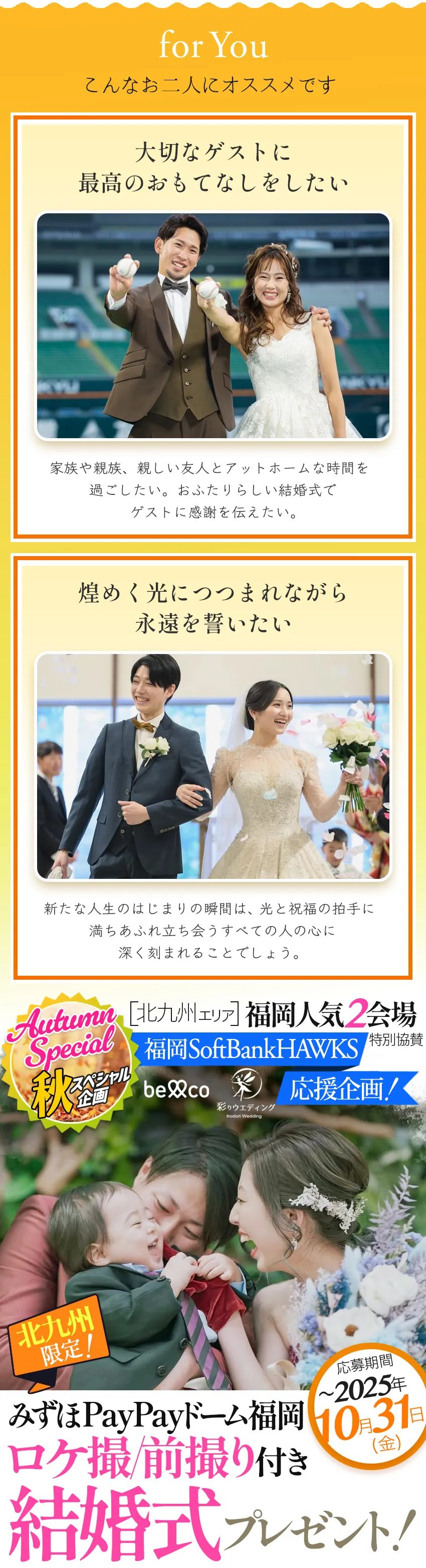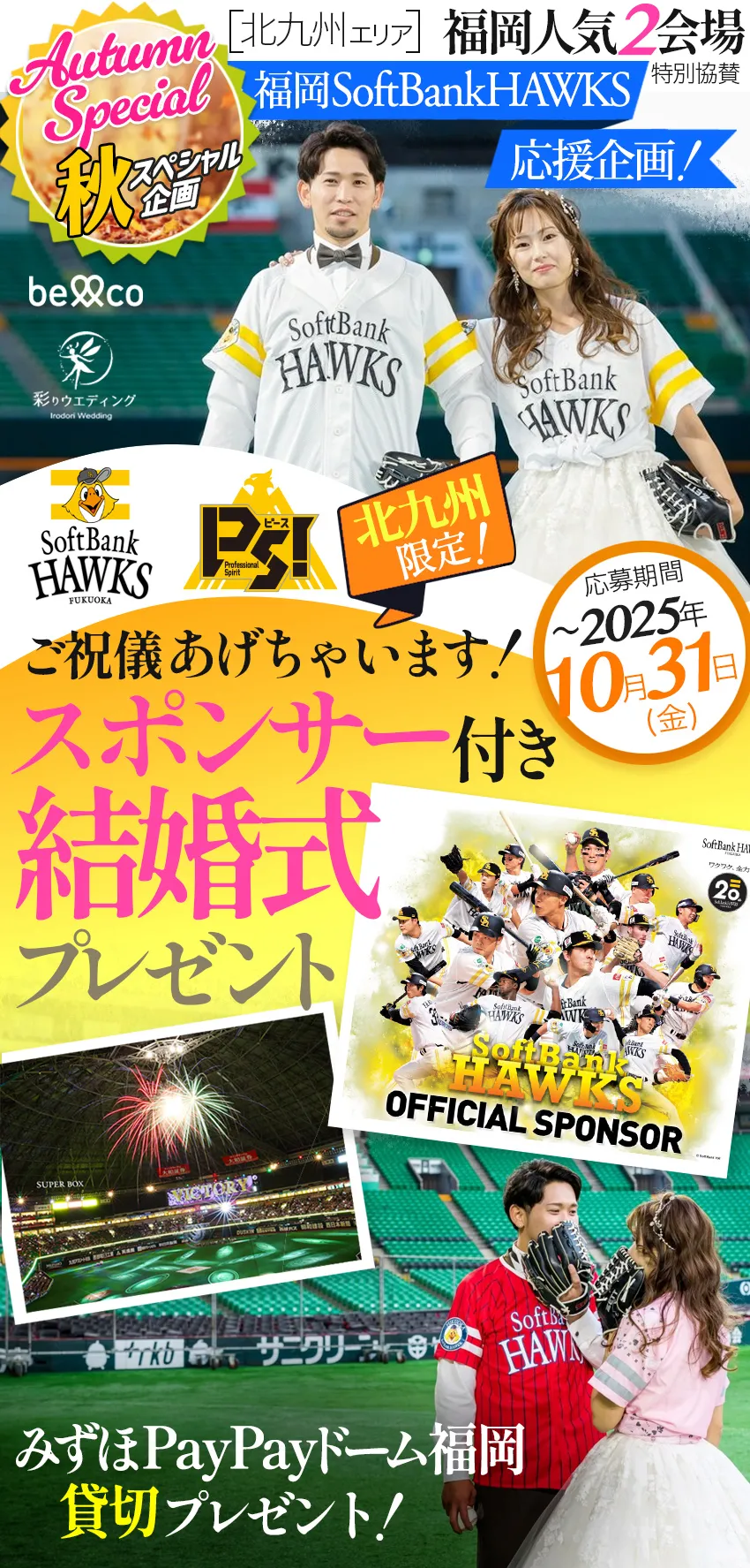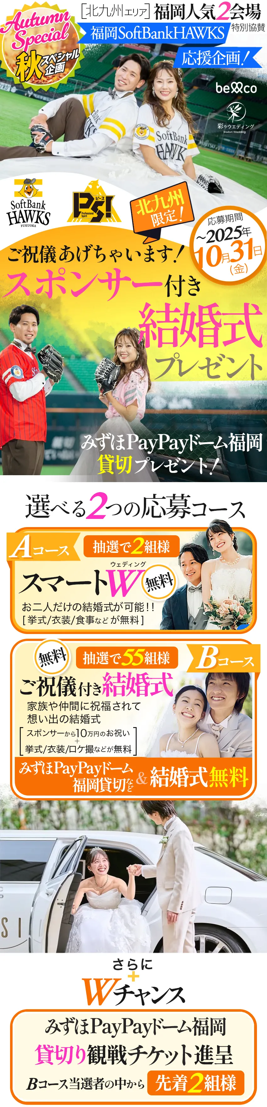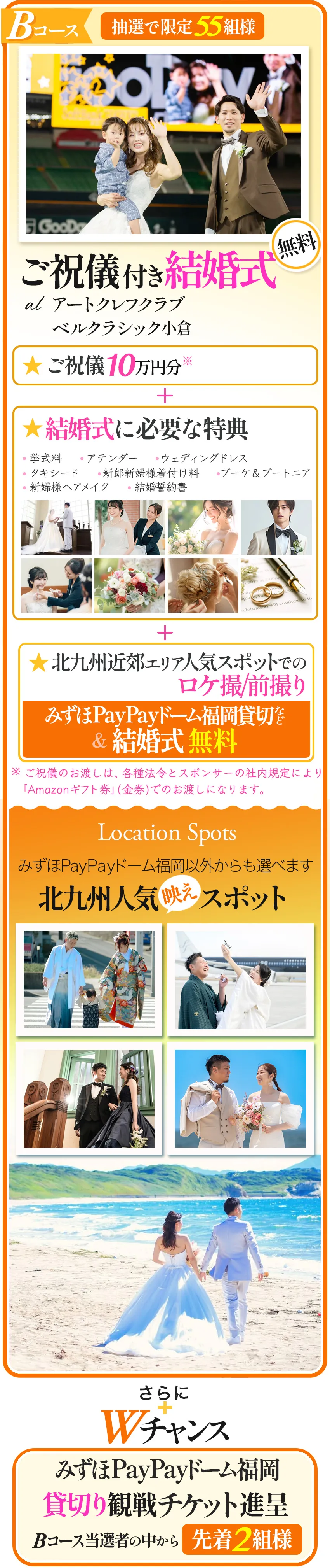 ★Aコース 限定\2組様/ /福岡県北九州 スマートW (ウェディング) 無料!! ✵お二人だけの結婚式が可能 ✵挙式/衣装/お食事などが無料 ★Bコース 限定\55組様/ /福岡県北九州 ご祝儀付き結婚式 無料!! ✵スポンサーから10万円のお祝い ✵挙式/衣装/ロケ撮などが無料 さらにWチャンス Bコース当選者の中から先着\2組様/に みずほPayPayドーム福岡 スーパーボックス貸切り観戦チケット進呈! |