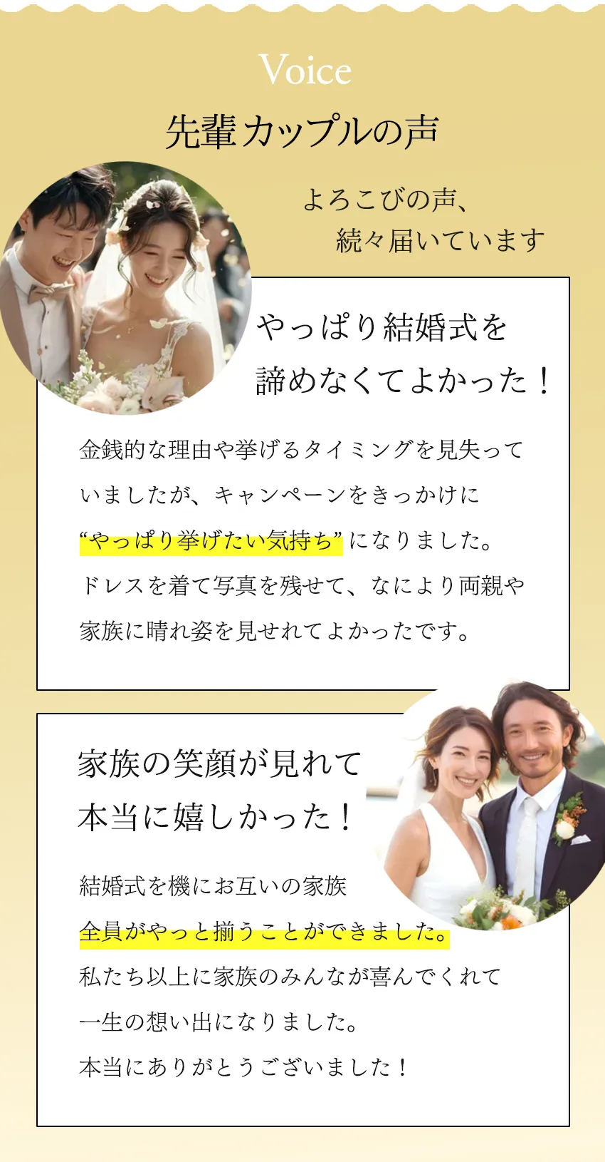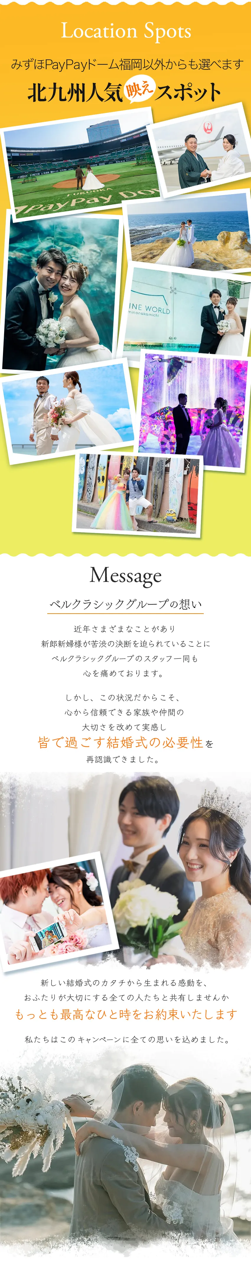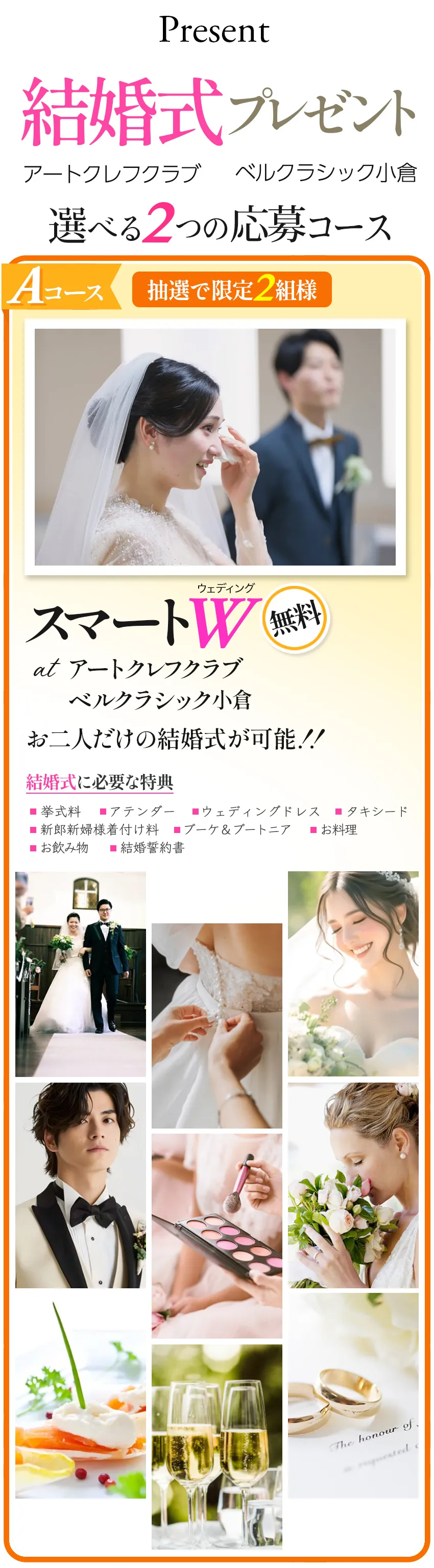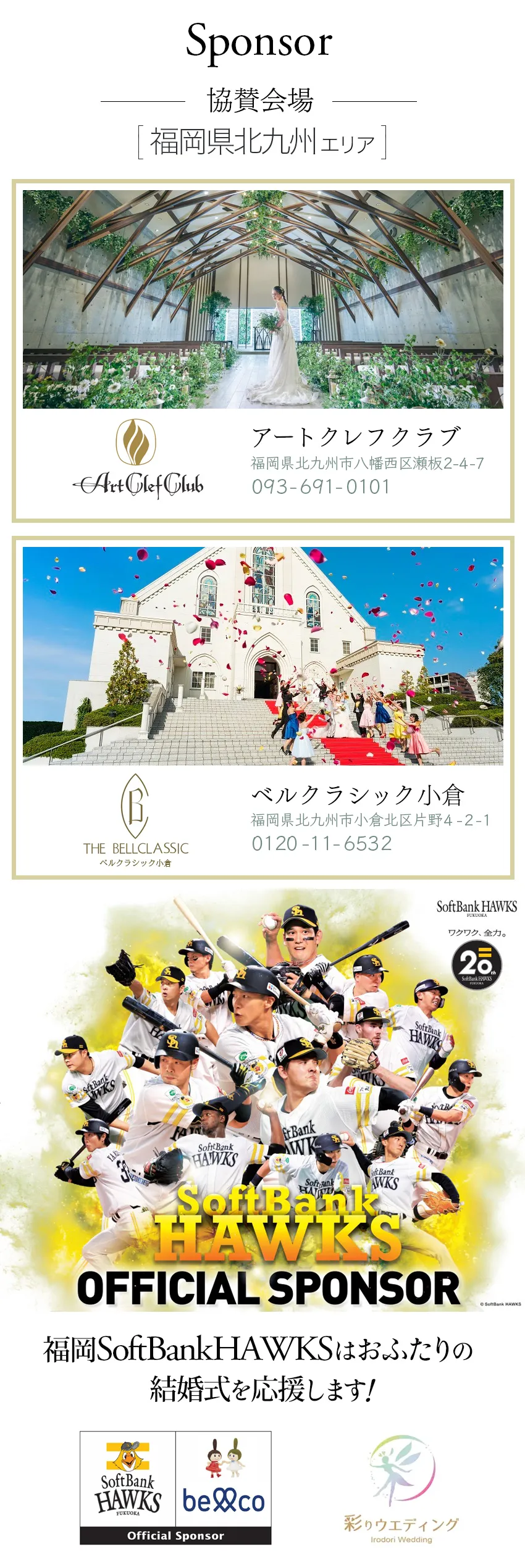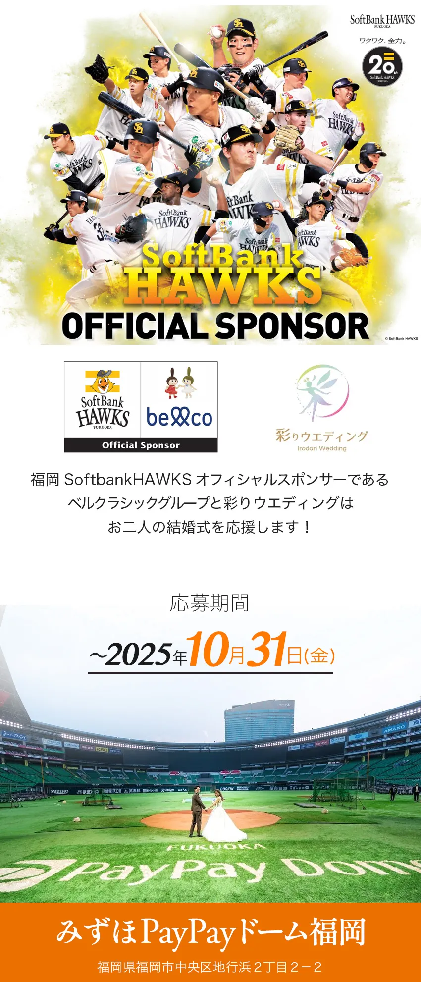 ★Aコース 限定\2組様/ /福岡県北九州 スマートW (ウェディング) 無料!! ✵お二人だけの結婚式が可能 ✵挙式/衣装/お食事などが無料 ★Bコース 限定\55組様/ /福岡県北九州 ご祝儀付き結婚式 無料!! ✵スポンサーから10万円のお祝い ✵挙式/衣装/ロケ撮などが無料 さらにWチャンス Bコース当選者の中から先着\2組様/に みずほPayPayドーム福岡 スーパーボックス貸切り観戦チケット進呈! |