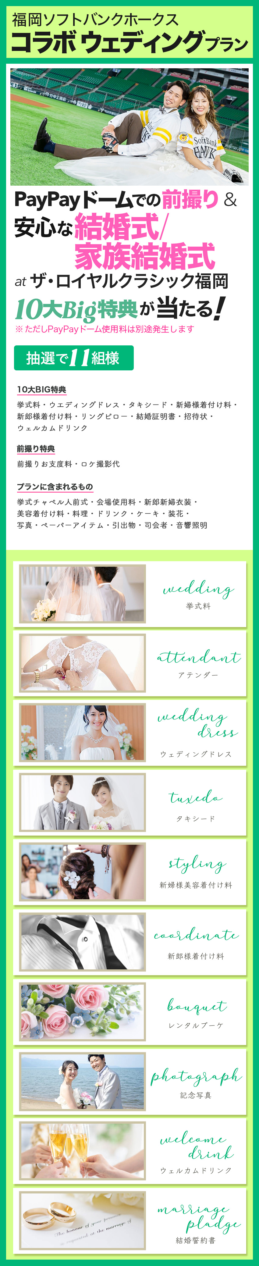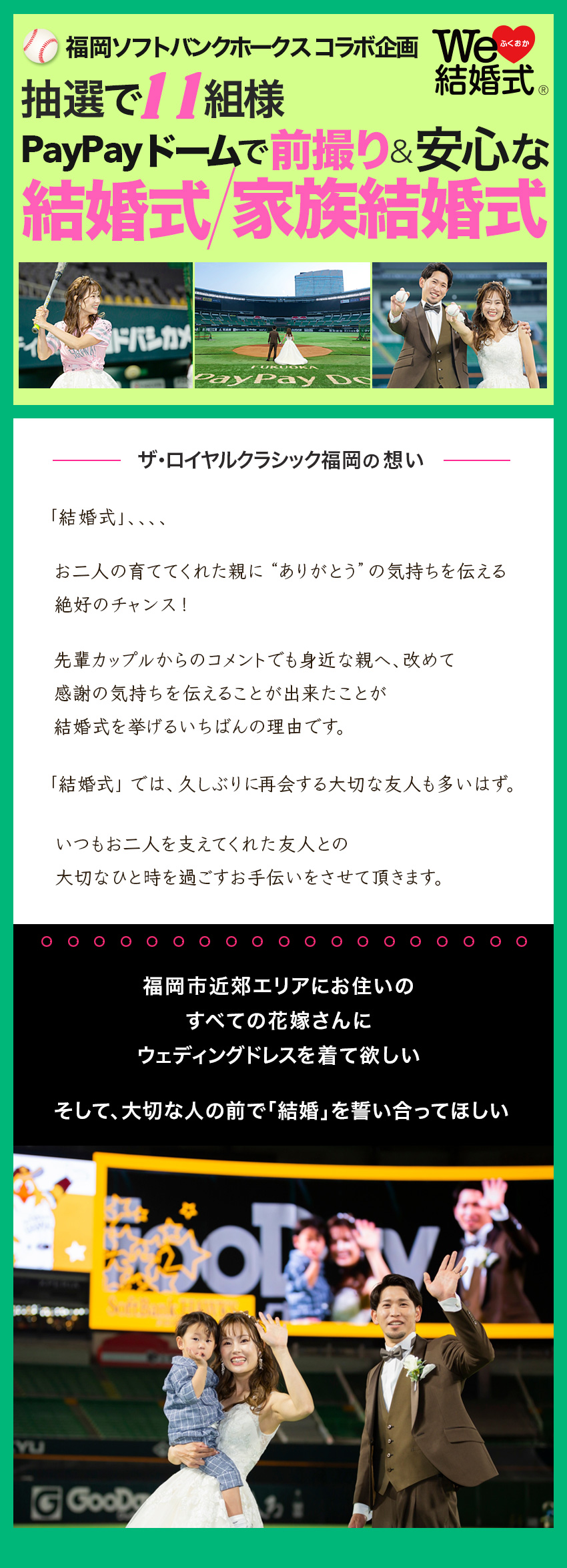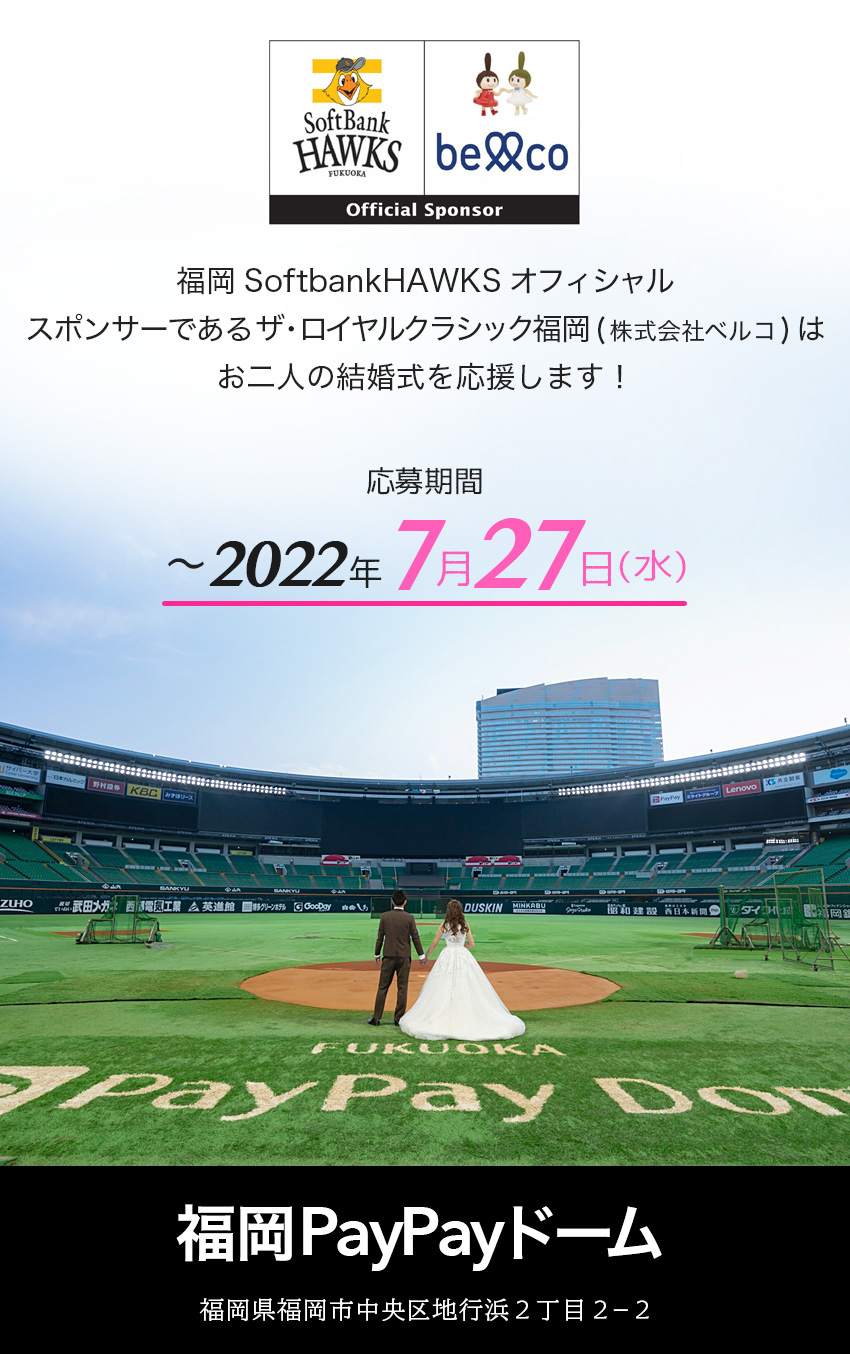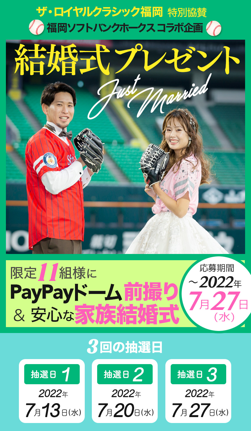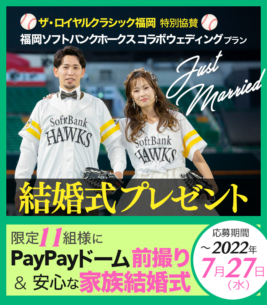 ★抽選で11組様に 福岡ソフトバンクホークスコラボ ウェディングプラン PayPayドーム前撮り & 安心な結婚式/家族結婚式 ※PayPayドーム使用料は別途発生します をプレゼント! |
