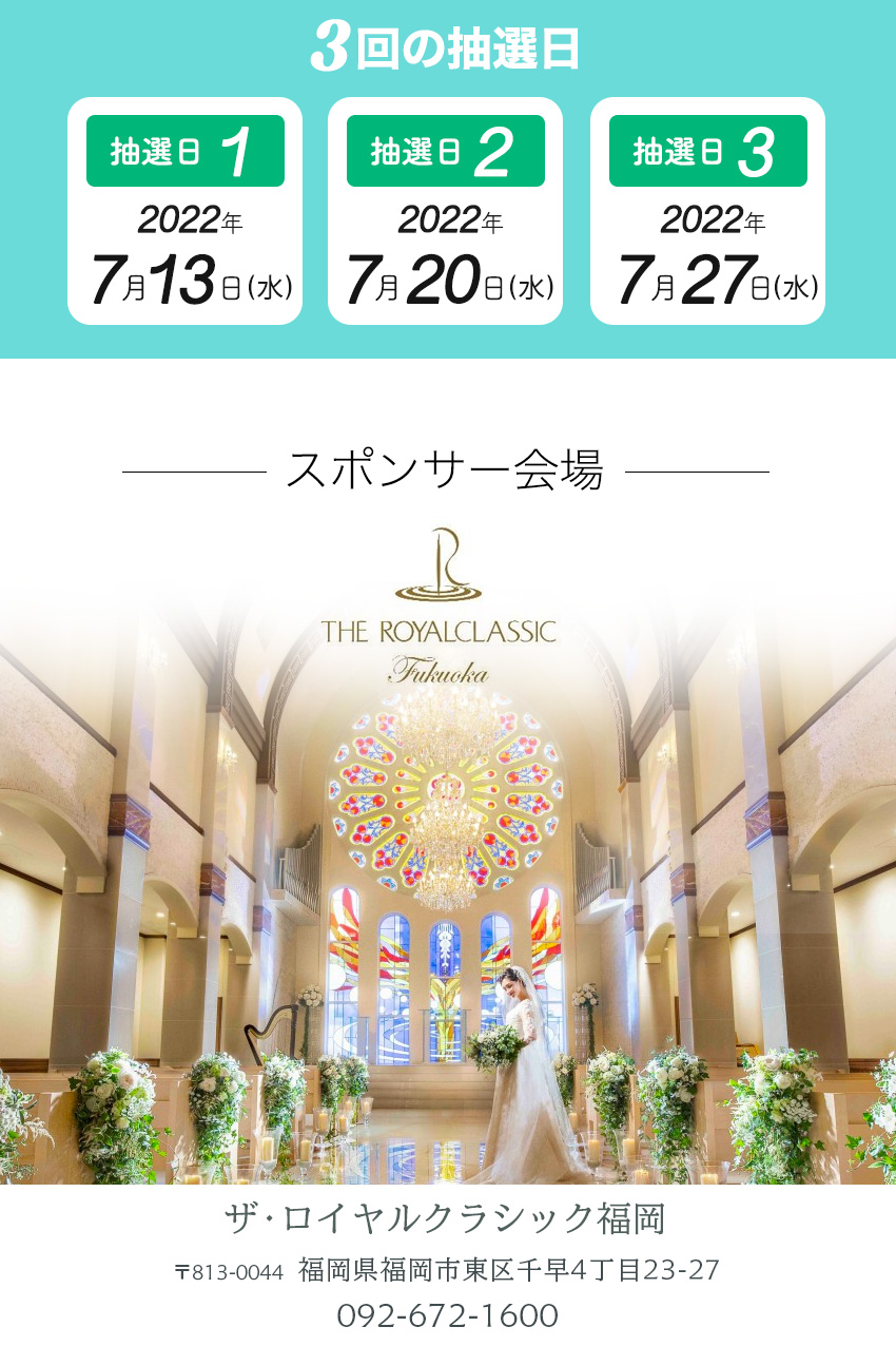 〜2022年7月27日(水) 総計3回のチャンス! 第1回抽選日 7月13日(水) 第2回抽選日 7月20日(水) 第3回抽選日 7月27日(水) |
