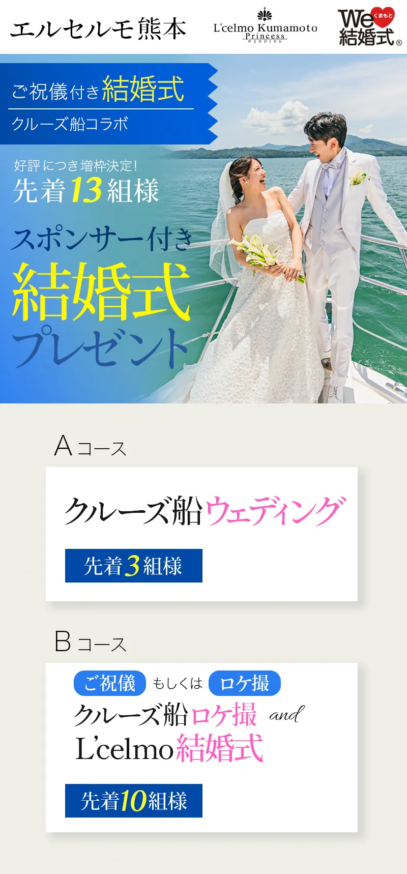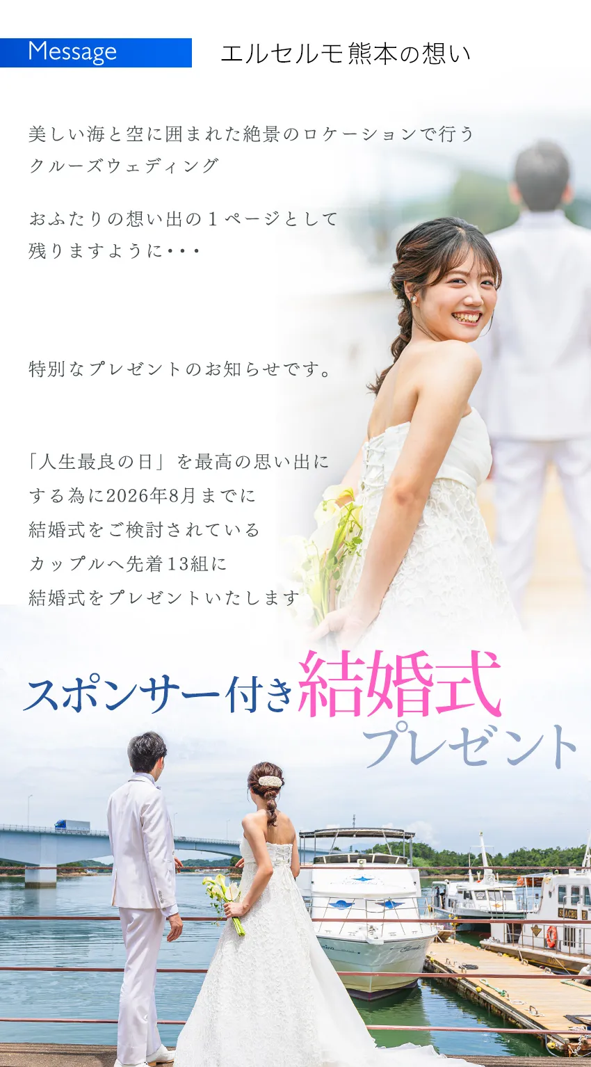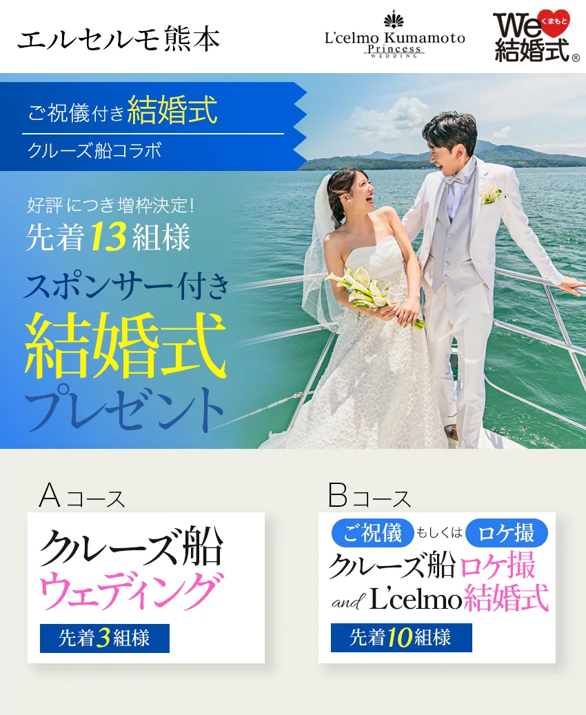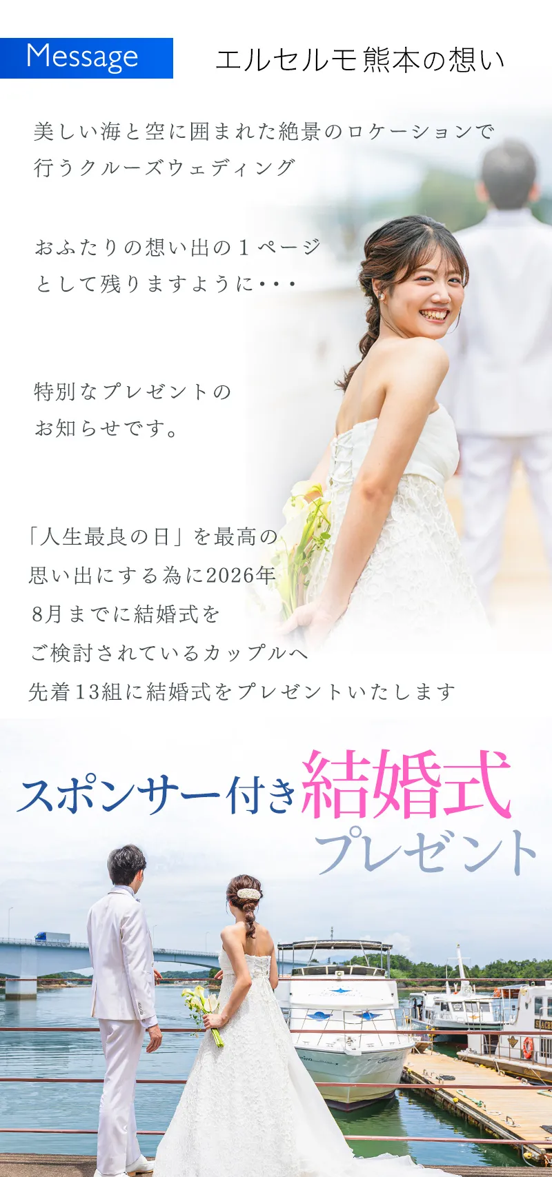 [Aコース] \先着3組様/ ⇒クルーズ船ウェディング [Bコース] \先着10組様/ ⇒ご祝儀付き クルーズ船でのロケ撮/前撮り and エルセルモ結婚式 at エルセルモ熊本 ご祝儀 (Amaonギフト券 50,000円) もしくは クルーズ船貸切料 |