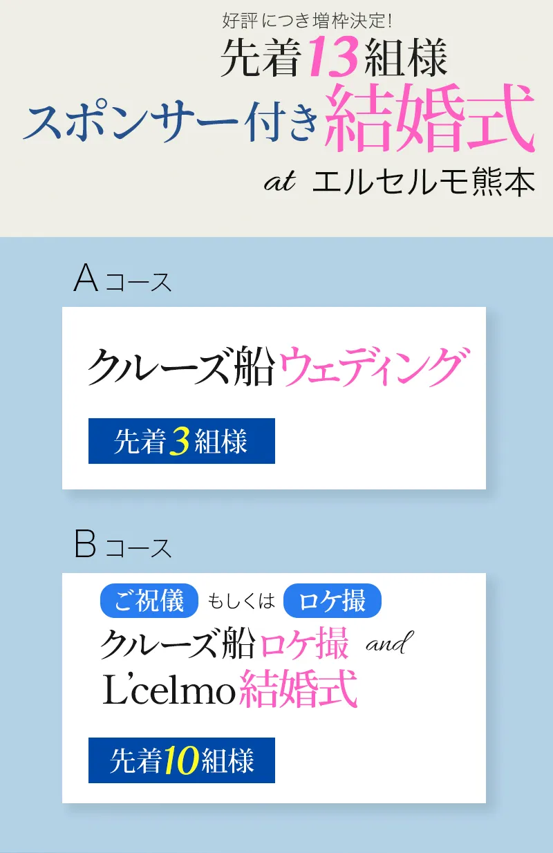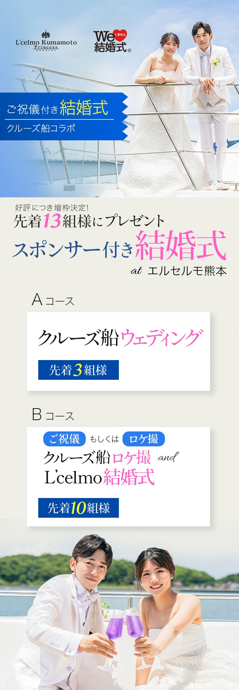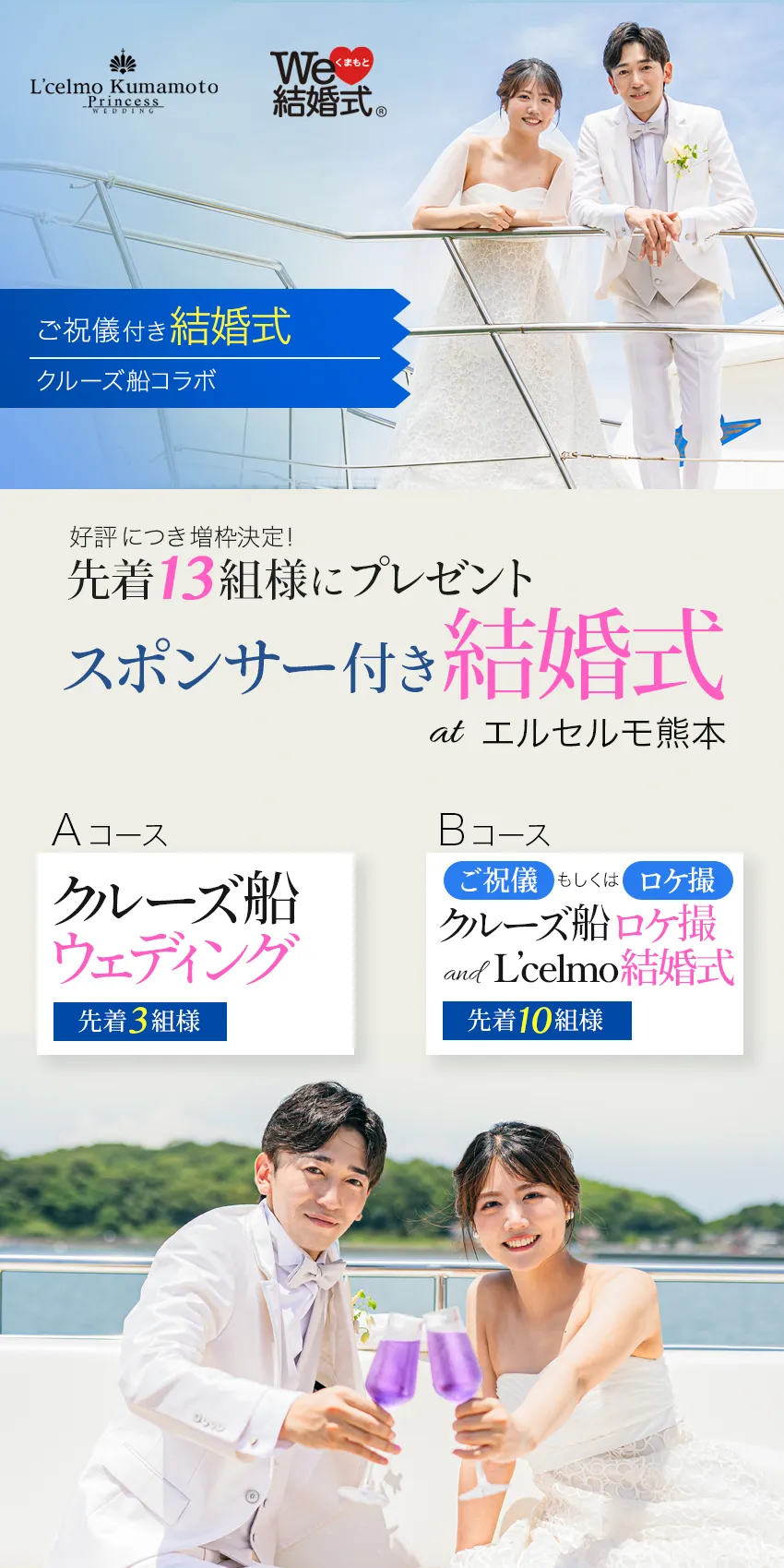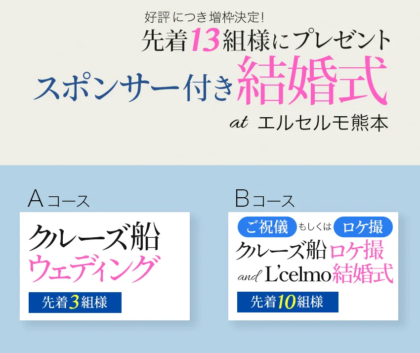 [Aコース] \先着3組様/ ⇒クルーズ船ウェディング [Bコース] \先着10組様/ ⇒ご祝儀付き クルーズ船でのロケ撮/前撮り and エルセルモ結婚式 at エルセルモ熊本 ご祝儀 (Amaonギフト券 50,000円) もしくは クルーズ船貸切料 |