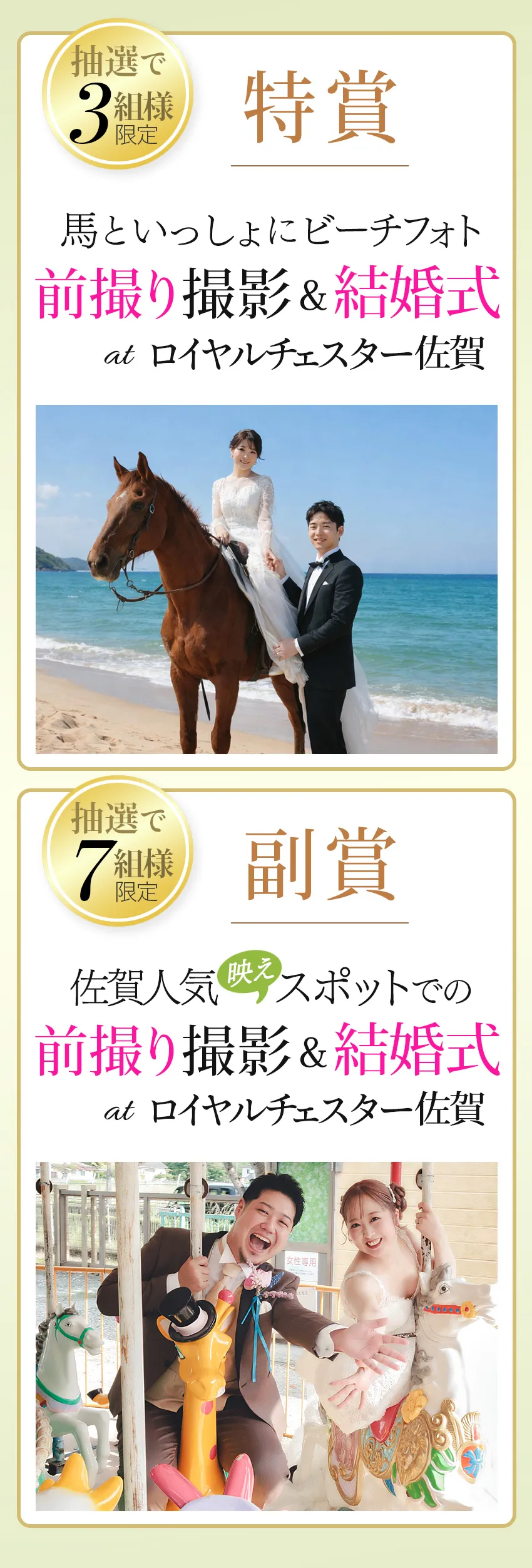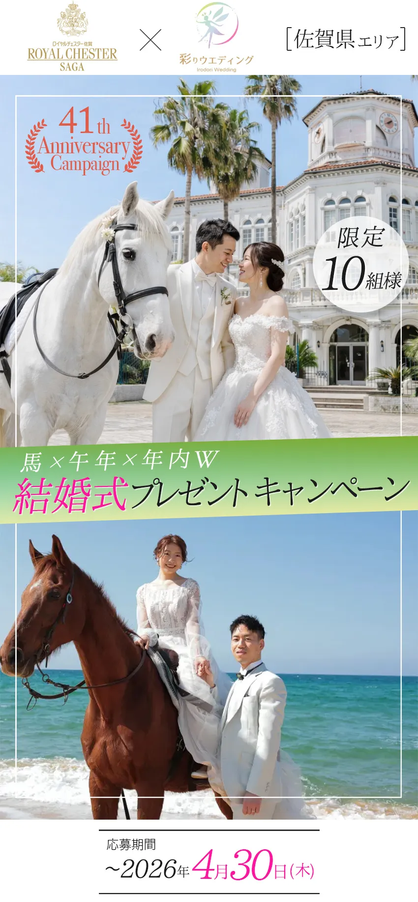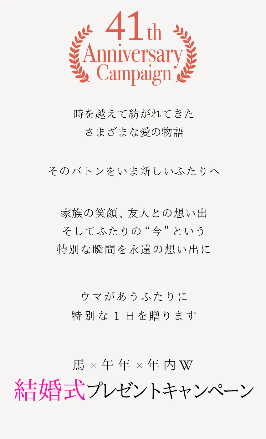 | 特典内容 | ★抽選で\10組様/ 馬 × 午年 × 年内W 結婚式プレゼントキャンペーン! |